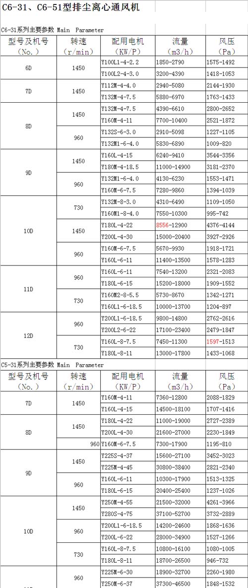 C6-31、C6-51型排塵風機、C6-51型離心通風機為排送含有塵埃木質(zhì)碎屑細碎前衛(wèi)等氣體的專用設(shè)備,如性能合適亦可作為其他通風用。但最高使用溫度200℃。